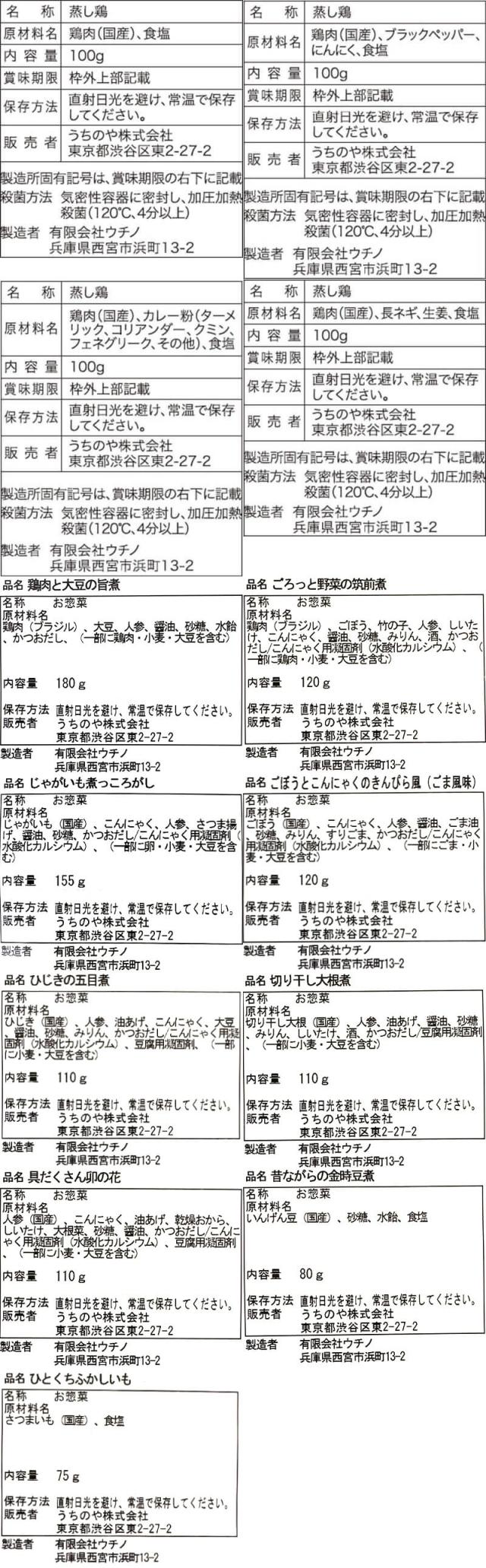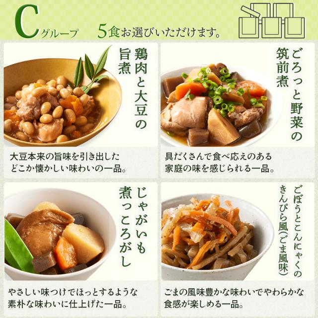 | 内容量 ※賞味期限 | ■ Aグループ 2食 国産鶏やわらか炭火焼き 80g 豚肉の角煮 120g 国産牛のすじこん煮こみ 110g トマトソースのハンバーグ(豆腐入り) 1個 オリジナルソースのハンバーグ(豆腐入り) 1個 鮭の塩焼き 1切 たっぷり野菜とあじの南蛮漬け 120g ぶり大根 125g さばの煮つけ 1切 さばの味噌煮 1切 ■ Bグループ 3食 牛すきやき丼 150g ごぼうと牛肉のしぐれ煮 100g 鶏団子の甘酢煮 125g 豚ばら軟骨 BBQソース 120g 照り焼きチキン 1切 びんちょうまぐろとこんにゃくの旨煮 125g 肉じゃが 160g 国産竹の子の含め煮 110g 国産鶏サラダチキンプレーン 100g 国産鶏サラダチキンブラックペッパー&ガーリック 100g 国産鶏サラダチキンカレー 100g 国産鶏サラダチキン長ネギ&生姜 100g ■ Cグループ 5食 鶏肉と大豆の旨煮 180g ごろっと野菜の筑前煮 120g じゃがいも煮っころがし 170g ごぼうとこんにゃくのきんぴら風(ごま風味) 120g ひじきの五目煮 110g 切り干し大根煮 110g 具だくさん卯の花 110g 昔ながらの金時豆煮 80g ひとくちふかしいも 75g 31種類の中から10食お選びいただけます。 |