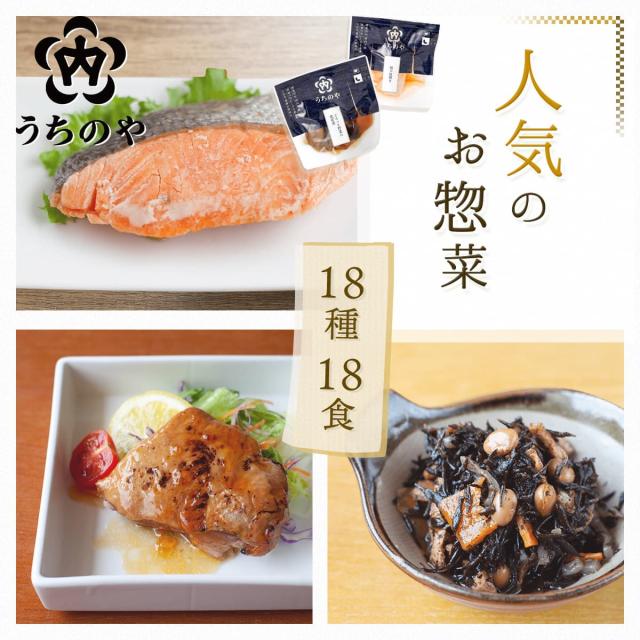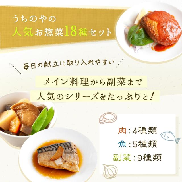 人気 惣菜 の 内野家 uchipac ウチパク シリーズ が「 うちのや 」へとリニューアル! うちのや 18食 詰め合わせ 常温保存 惣菜セット肉じゃが ハンバーグ や 煮魚 焼き魚 煮物 おばんざい 等 肉 魚 野菜 の お惣菜 で種類も豊富。 毎日 の 食事 や お弁当 の おかず お惣菜 にも お手軽 簡単 調理 で 時短 ごはん に最適!
