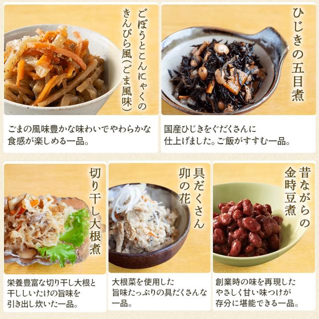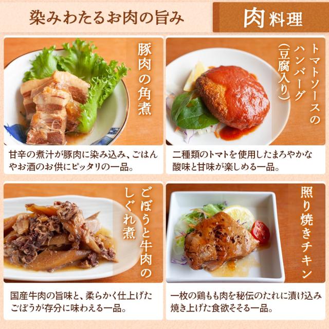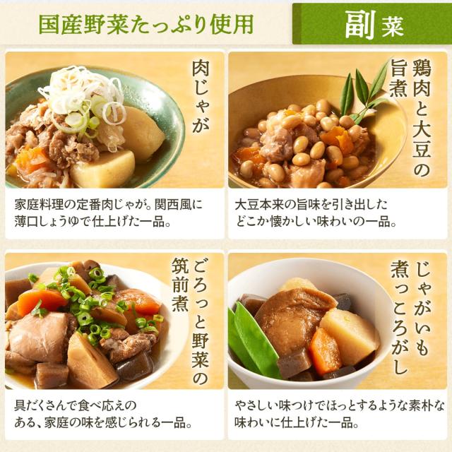 | 内容量 | ■ うちのや 豚肉の角煮 120g トマトソースのハンバーグ(豆腐入り) 1個 ごぼうと牛肉のしぐれ煮 100g 照り焼きチキン 1切 鮭の塩焼き 1切 たっぷり野菜とあじの南蛮漬け 120g ぶり大根 125g さばの煮つけ 1切 びんちょうまぐろとこんにゃくの旨煮 125g 肉じゃが 160g 鶏肉と大豆の旨煮 180g ごろっと野菜の筑前煮 120g じゃがいも煮っころがし 170g ごぼうとこんにゃくのきんぴら風(ごま風味) 120g ひじきの五目煮 110g 切り干し大根煮 110g 具だくさん卯の花 110g 昔ながらの金時豆煮 80g 18種 18食 |