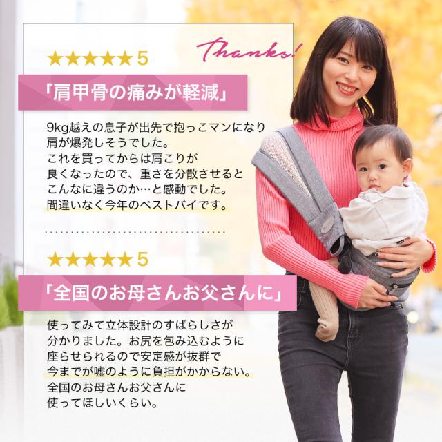- 商品の配送変更も迅速に対応して頂きありがとうございました。 重くなってきた孫の抱っこに購入しました。腕、腰の負担が減ってとても安定して抱くことができました。