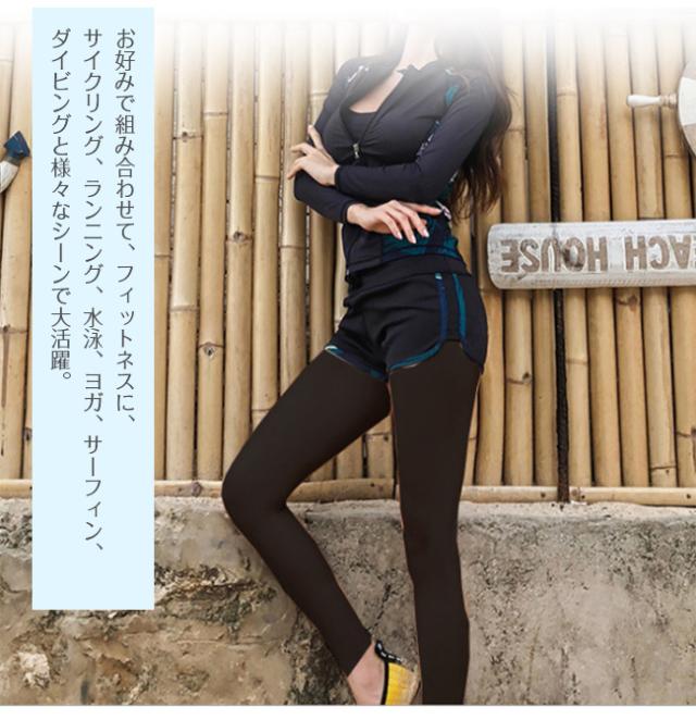 体型をカバー 足を引き締めて見せるレギンスとショートパンツを組み合わせたり、長袖ラッシュパーカーと合わせることで、さりげなく体型をカバーすることができます。