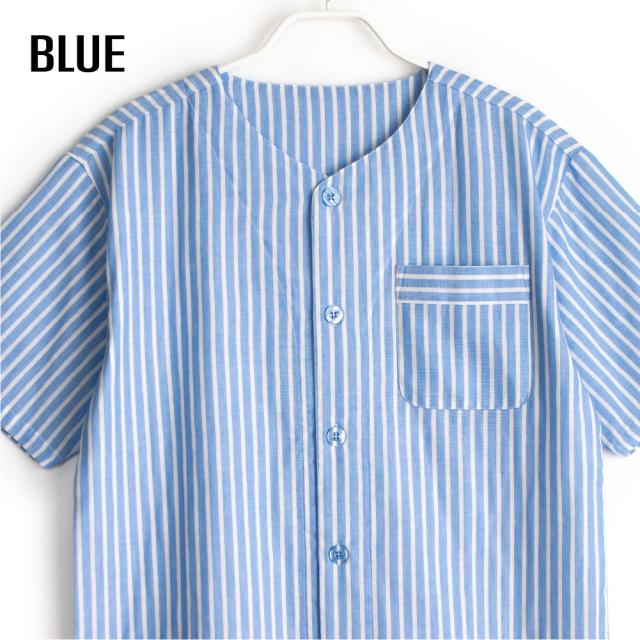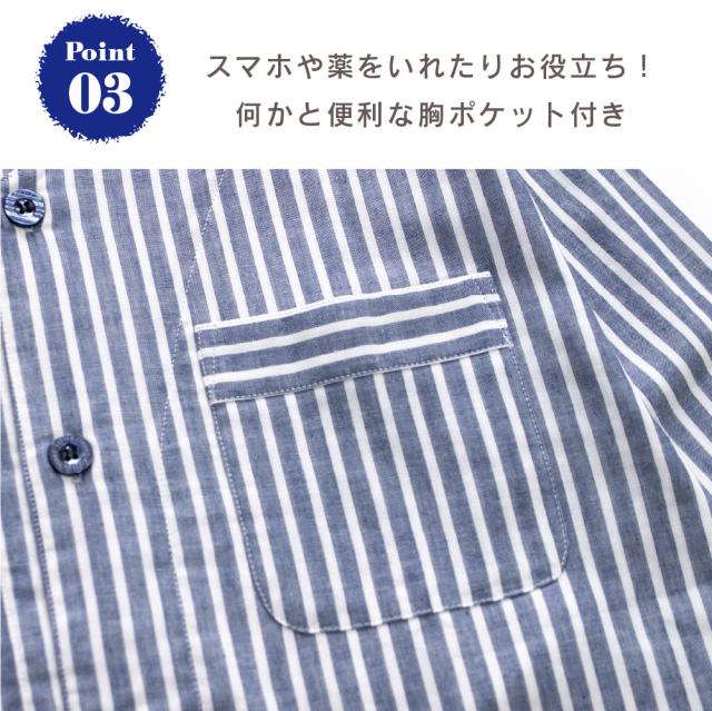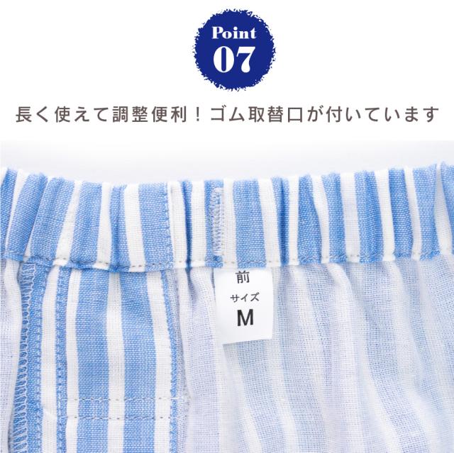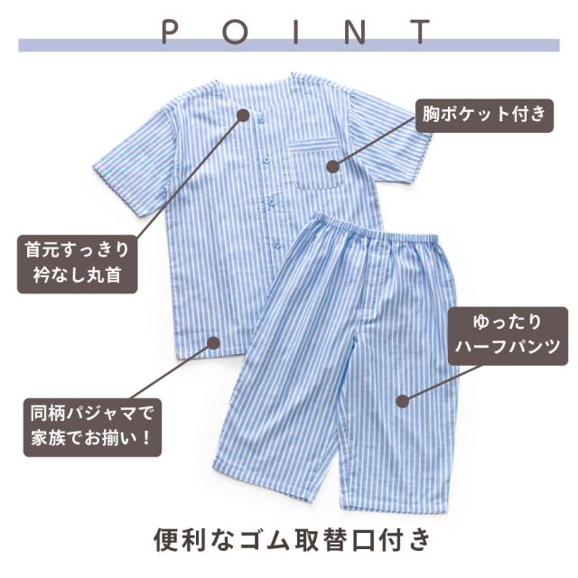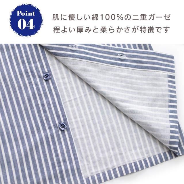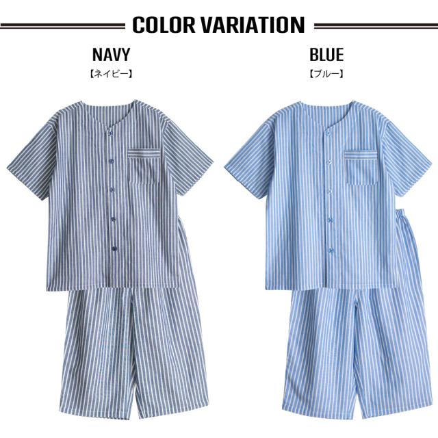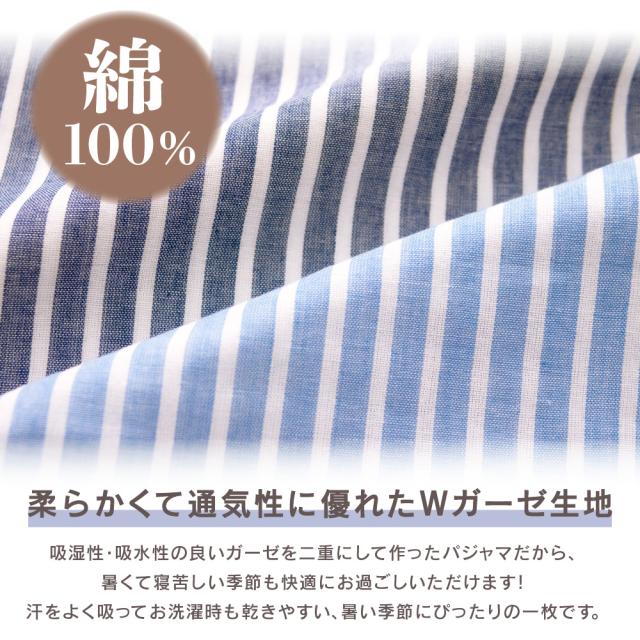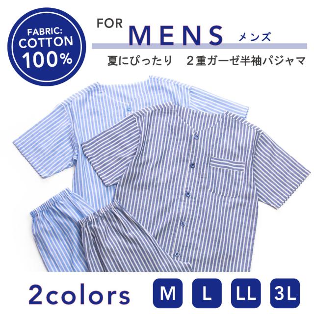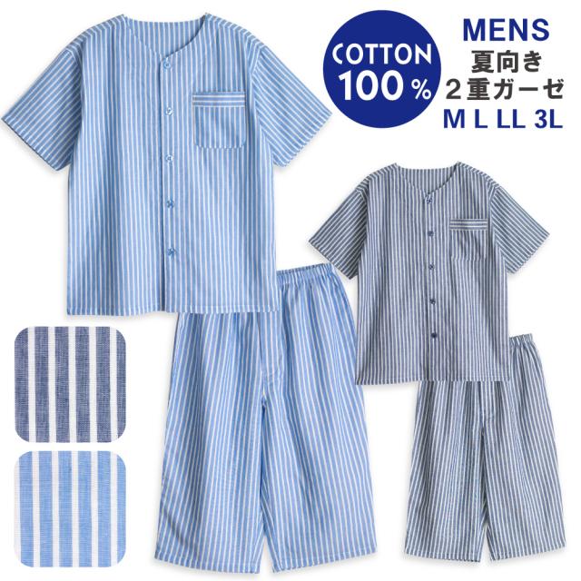 パジャマ メンズ 綿100%ダブルガーゼ 半袖 夏 前開き ボタン ストライプ ブルー ネイビー M L LL 3L 家族おそろい 親子おそろい お客様用 入院用 父の日 敬老の日 紳士用 二重ガーゼ
