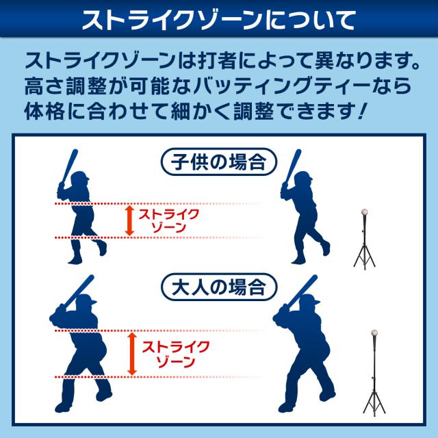 【最小71cm〜最大112cmまで調整できる】身長やストライクゾーン、苦手なコースなど、使う人に合わせて細かく高さ調整が可能!お子様から大人まで、手軽に自主練習ができるバッティングティーになります。