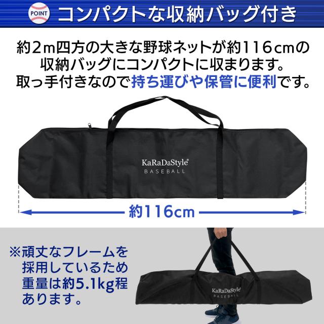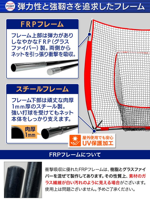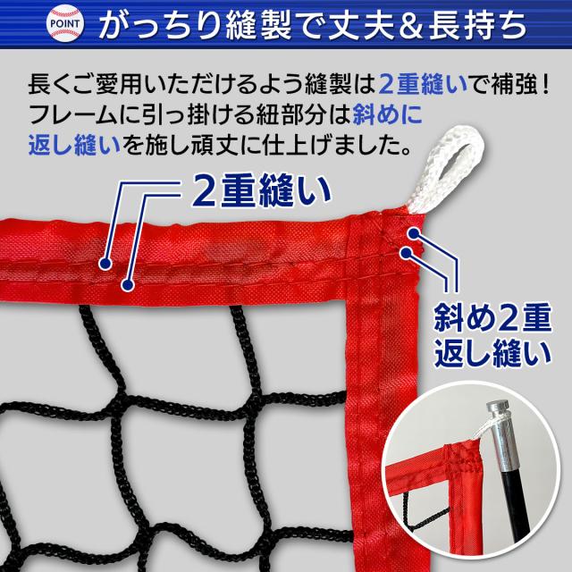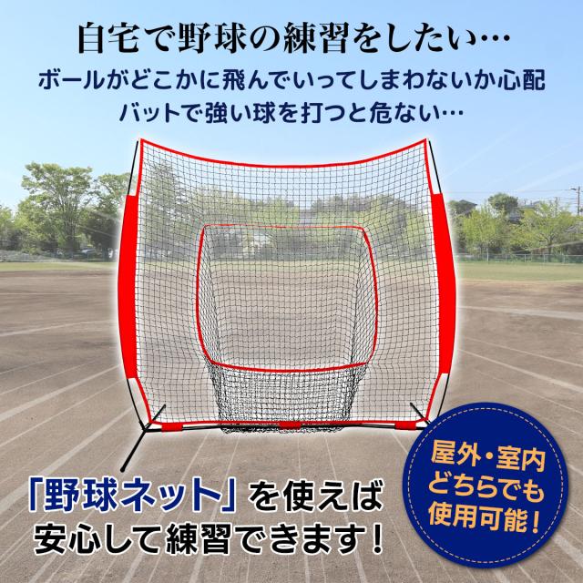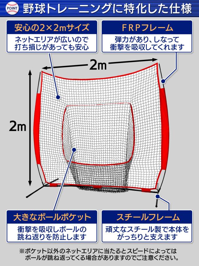 【野球トレーニングに特化した造り】打ち損じがあっても、ボールが飛び出にくいように安心の2×2mサイズを採用。また「2種類のフレーム」と「7本撚りのネット」にしたことで、頑丈な野球ネットになっています。※設置する際は付属のペグか重りを置いてご利用いただくことを推奨いたします。