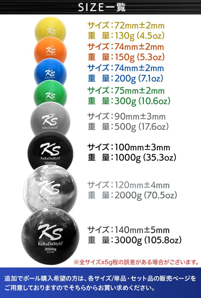 ボール:【130g】直径72mm 【200g】直径74mm 【300g】直径75mm 【500g】直径90mm