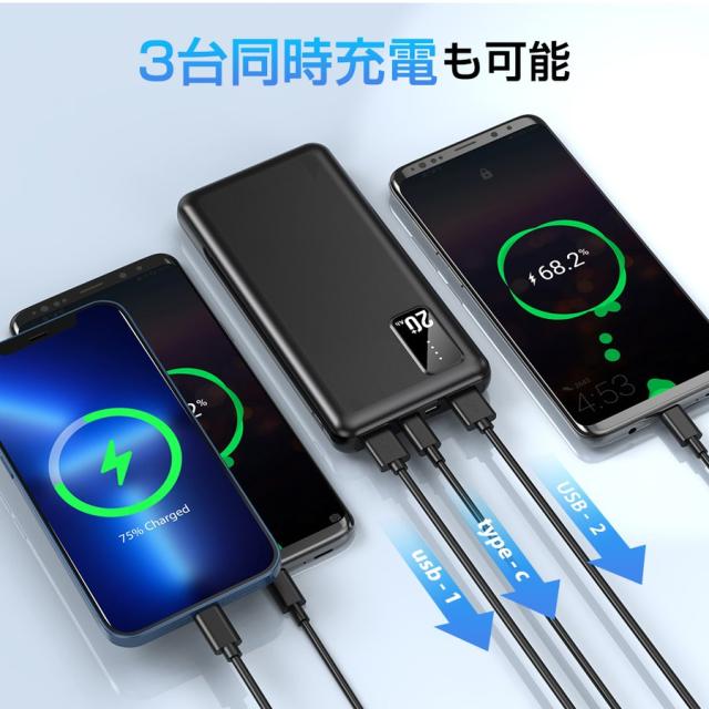 携帯充電器が入力ポートで モバイルバッテリー 本体を充電できます。(注意:同時に複数の方式で本体を充電することはできません。) USB -Aポートx2とUSB-C入出力ポートの出力方式で同時に3台の設備を充電することができます。3つの機器へ同時にフルスピード充電が可能です。