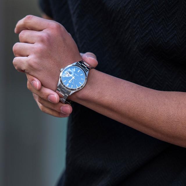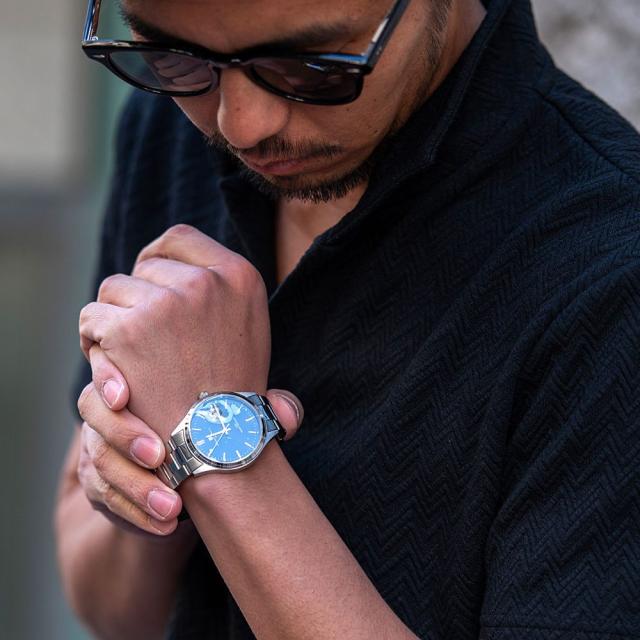 オールステンレスの堅牢なボディに宿る、サンレイ加工の鮮やかな文字盤カラーバリエーションは、あらゆるシーンで輝きを放ちます。