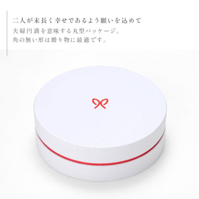 丸形パッケージは夫婦円満を意味し、二人が末長く幸せであるよう願いを込めています。