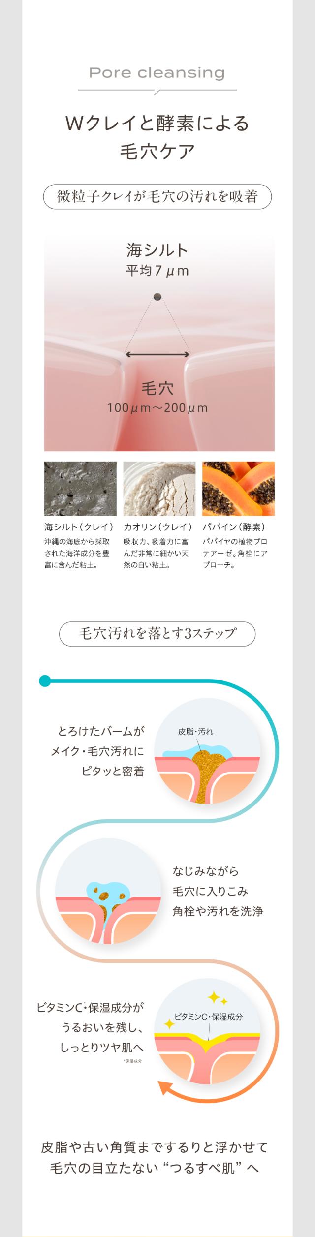 毛穴より小さい超微粒子の海シルト*・カオリン*のクレイ2種×パパイン*酵素を配合。 毛穴の奥の汚れ・黒ずみ・角栓・ザラつきをしっかり吸着・分解・除去。 (※汚れが落ちることによる ※皮膚コンディショニング剤)
