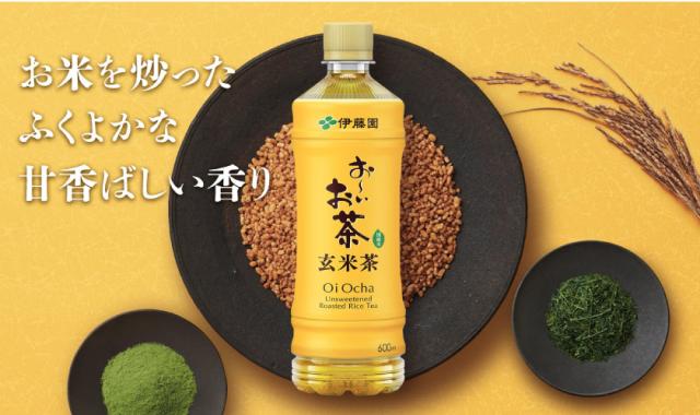 「お〜いお茶 玄米茶」は、こだわりの国産米を100%使用し、炒ったお米と緑茶をブレンド。お米特有の甘香ばしい香りをお楽しみいただけます。
