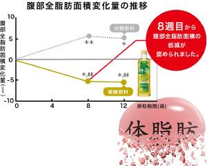 ![]() | 体脂肪は、分解しないと減りません。 体脂肪はそのままではうまく消費することができません。ついてしまった体脂肪は、まず分解され、その分解された脂肪が燃焼することで、消費されます。 サントリー特茶は、脂肪分解酵素を活性化させるケルセチン配糖体の働きにより、体脂肪を減らすのを助けます。 特茶を1日1本継続飲用し、一般的な(ケルセチン配糖体を含まない)緑茶と比較した結果、8週目から体脂肪の低減が認められました。 |