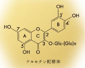 ![]() | 「ケルセチン」とは、マメ科の落葉高木「エンジュ」の花のつぼみからとれる植物由来の成分で、玉ねぎやブロッコリー、リンゴなどの野菜や果物に多く含まれているポリフェノールの一種です。 水に溶けにくい性質を持つケルセチンは、そのままでは体内に吸収されづらいという問題がありましたが、研究の結果それを解決。 糖と組み合わせた「ケルセチン配糖体」にすることで、水溶性が向上し、飲料適性も体内への吸収率も高まったのです。 「ケルセチン配糖体」のことを、水に溶かしたときのキレイな金色になぞらえて、サントリーでは独自に「ケルセチンゴールド」と名付けました。 特茶1本に110mg含まれており、これは玉ねぎ約3個分に相当する量です。 |
