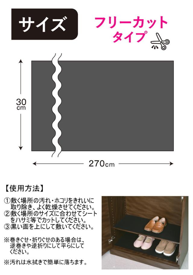 火のそば、高温になる場所での使用やアイロンの使用はしないでください。 湿気の多い場所ではシートを敷き放しにせず、少なくとも一年に一度は敷き替えてください。 使用状況により、消臭・抗菌・防カビ加工の効力持続期間が変わる場合があります。 本品は押入れやタンス、食器棚や流し台下などの収納部分に敷くシートです。それ以外の用途には使用しないでください。 |