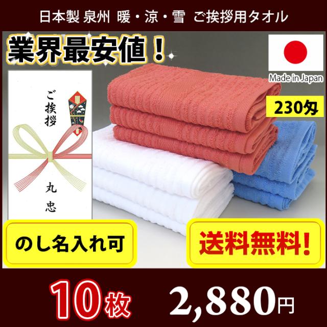 【送料無料】小口 同色10枚セット 引っ越し ご挨拶用タオル(のし紙名入れ) 日本製 泉州 暖・涼・雪 230匁 フェイスタオル