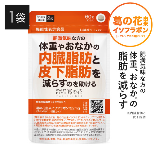 | 届出表示 | 本品には、葛の花由来イソフラボン(テクトリゲニン類として)が含まれます。 葛の花由来イソフラボン(テクトリゲニン類として)には、肥満気味な方の、体重やお腹の脂肪(内臓脂肪と皮下脂肪)やウエスト周囲径を減らすのを助ける機能があることが報告されています。 |