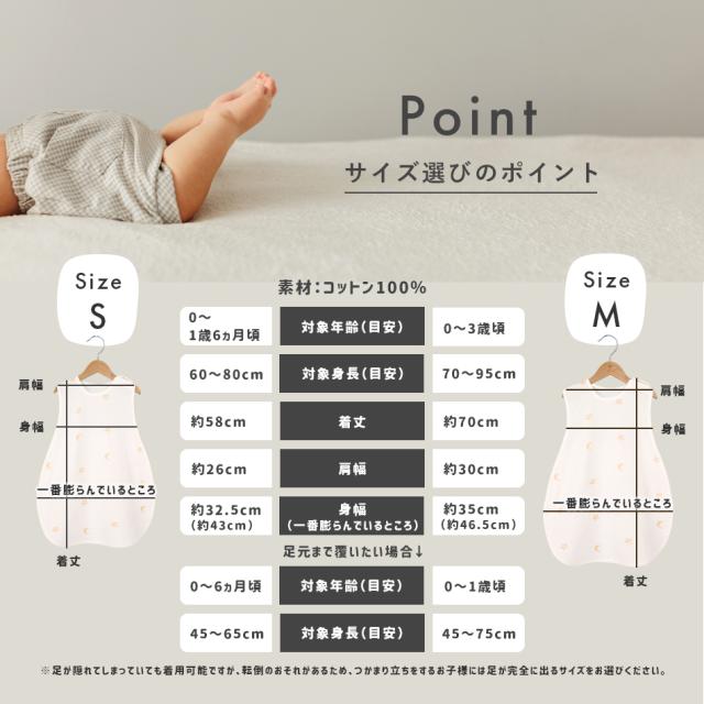 ※足が隠れてしまっていても着用可能ですが、転倒のおそれがあるため、つかまり立ちをするお子様には足が完全に出るサイズをお選びください。
