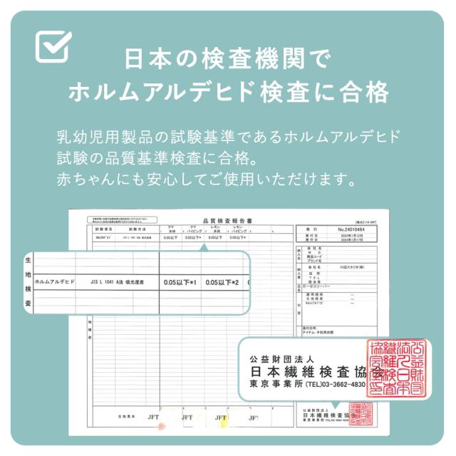 乳幼児用製品の試験基準であるホルムアルデヒド検査の品質基準検査に合格しました。