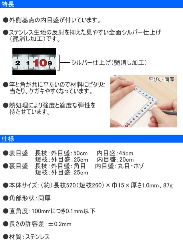 曲尺 平ぴた シルバー 50cm 裏面角目 JIS 10016 ものさし 定規 曲尺 ステンレス製 測定 シンワ測定 シルバー 日本製
