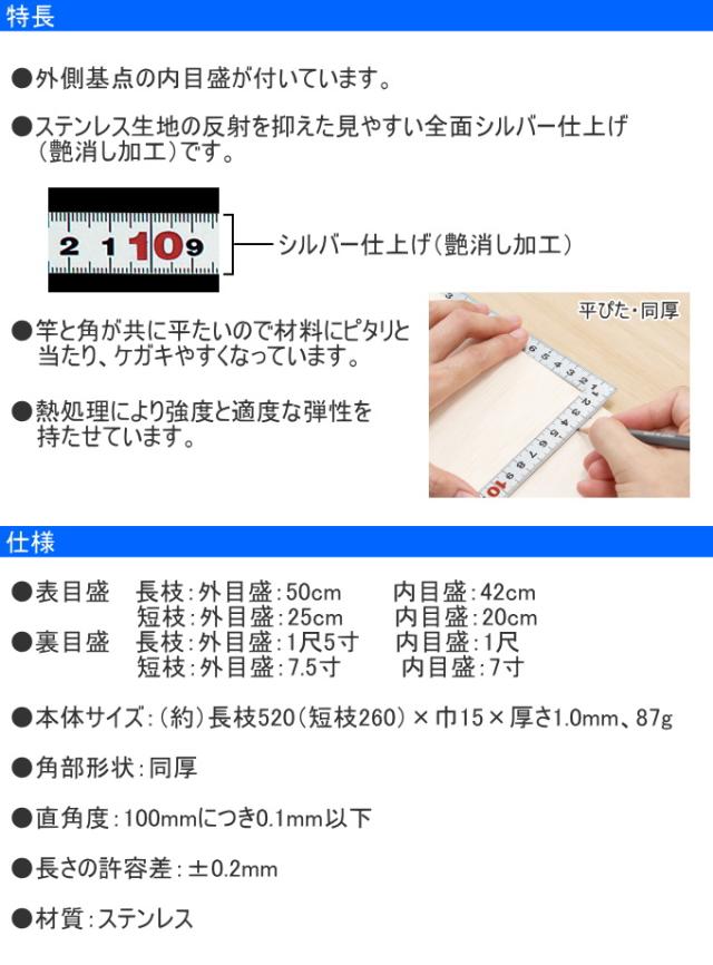 曲尺 平ぴた シルバー 50cm/1尺5寸 併用目盛 10044 ものさし 定規 曲尺 ステンレス製 測定 シンワ測定 シルバー 日本製