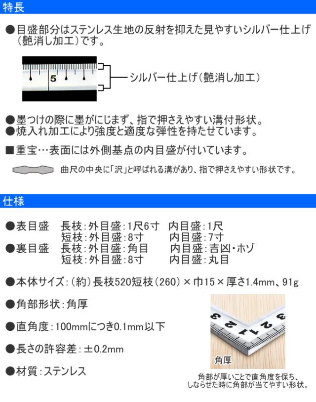 曲尺 角厚 シルバー 重宝 1尺6寸 裏面角目 10372 ものさし 定規 曲尺 ステンレス製 測定 シンワ測定 シルバー 日本製