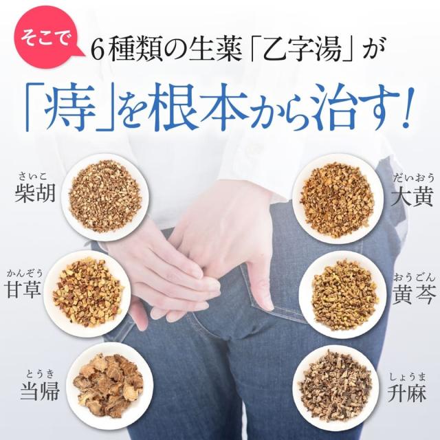 乙字湯エキス(2/3量) トウキ‥‥4.00g サイコ‥‥3.33g オウゴン‥‥2.00g カンゾウ‥‥1.33g ショウマ‥‥1.00g ダイオウ‥‥0.67g より抽出 添加物として、乳糖、セルロース、メタケイ酸アルミン酸Mg、ステアリン酸mgを含有する。 |