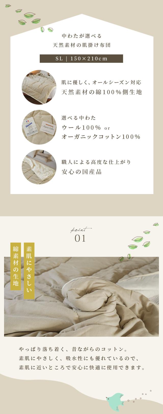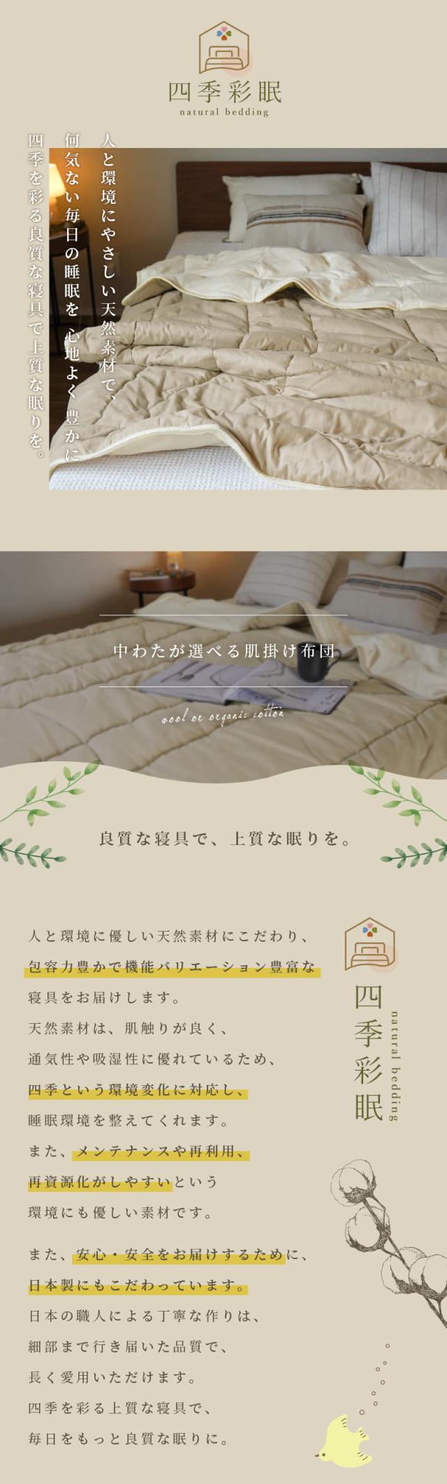 四季彩眠 肌布団 シングル ロング 側生地綿100 中わたが選べる 羊毛100% オーガニックコットン 国産 肌掛け 布団 キルトケット 通年