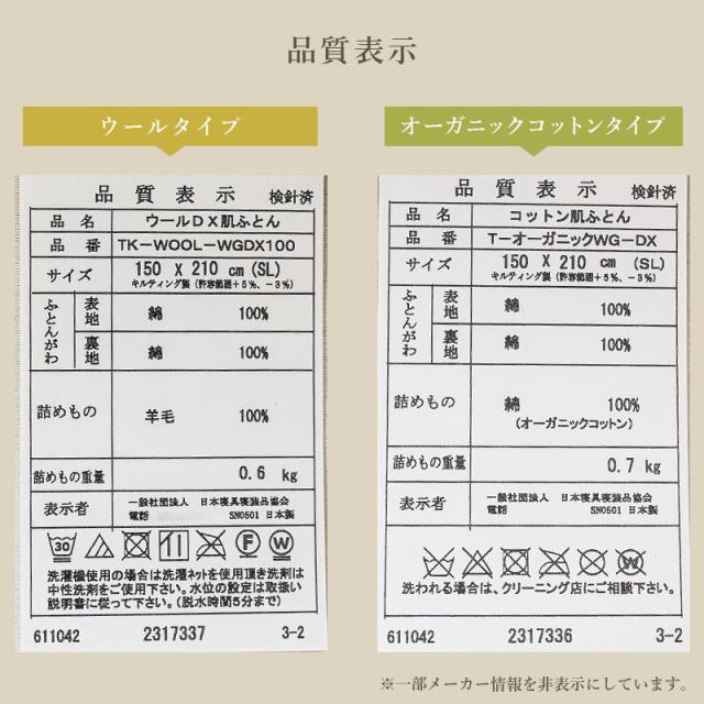 | その他注意 | ■中綿オーガニックコットンタイプは洗うことができません。洗われる場合は、クリーニング店にご相談ください |