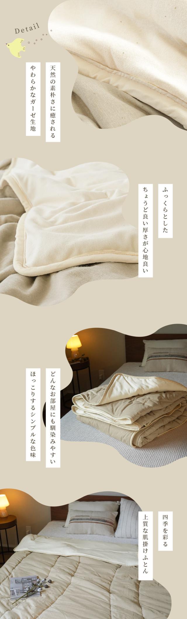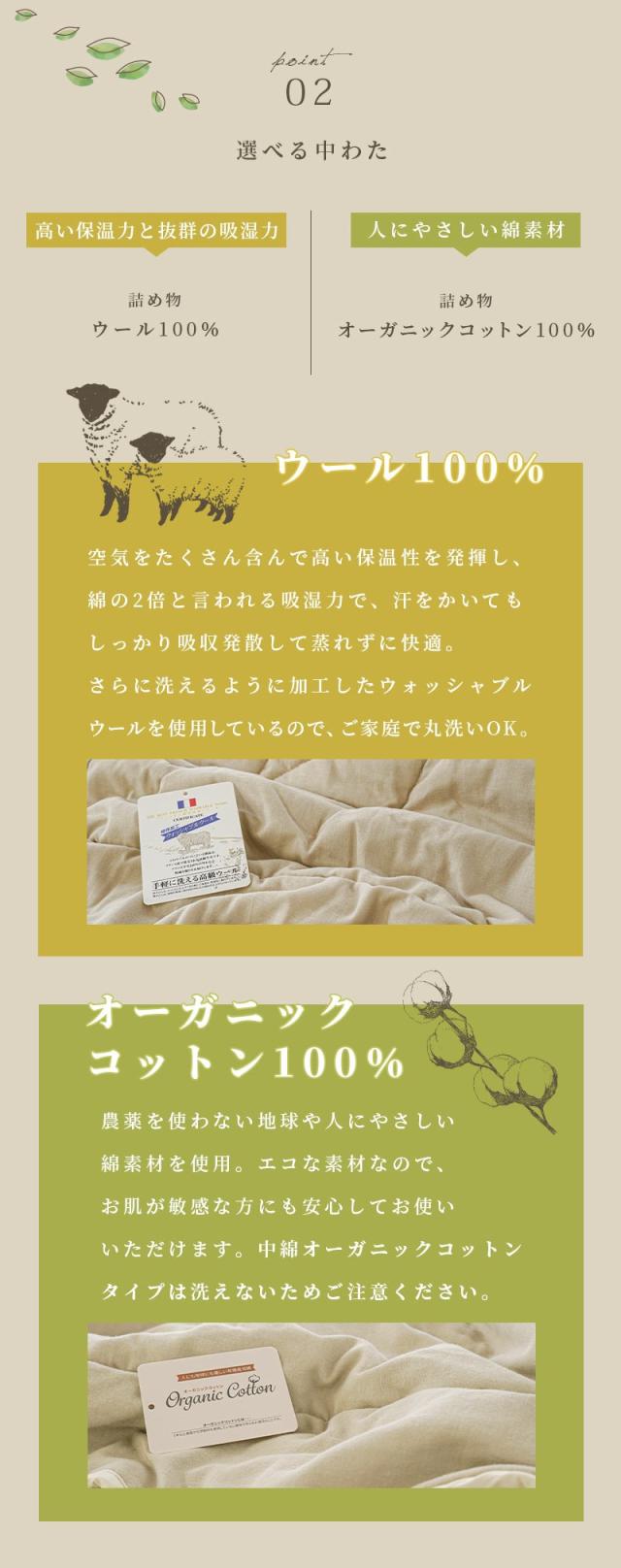 | ・素肌にやさしい、綿素材の生地 やっぱり落ち着く、昔ながらのコットン。素肌にやさしく、吸水性にも優れているので、素肌に近いところで安心に快適に使用できます。 ・選べる中綿高い保湿力と抜群の吸湿力の詰め物ウール100%と人にやさしい詰め物オーガニックコットン100%の2種類から選べます。 ・ウール100%空気をたくさん含んで高い保湿性を発揮し、綿の2倍と言われる吸湿力で、汗をかいてもしっかり吸収発散して蒸れずに快適。さらに洗えるように加工したウォッシャブルウールを使用しているので、ご家庭でも丸洗いOK。 ・オーガニックコットン100%農薬を使わない地球や人にやさしい綿素材を使用。エコな素材なので、お肌が敏感な方にも安心してお使いいただけます。中綿オーガニックコットンタイプは洗えないためご注意ください。 ・からだにフィットする特殊なキルトからだにフィットするように曲線状のキルト縫製が施されており、やさしく体に寄り添い包み込まれるような感覚で、心地良くおやすみいただけます。 ・温度調節にも便利でオールシーズン使える春夏の汗ばむ季節はこれ1枚で、暑がりさんは秋口にもおすすめ。冬は他の寝具と併用することでオールシーズンお使いいただけます。 ・眠りにもっと安心を、高品質の国産品安心のねむりは安心の品質から。国内工場で一つ一つ丁寧に生産された、高品質の肌掛け布団です。 | |
