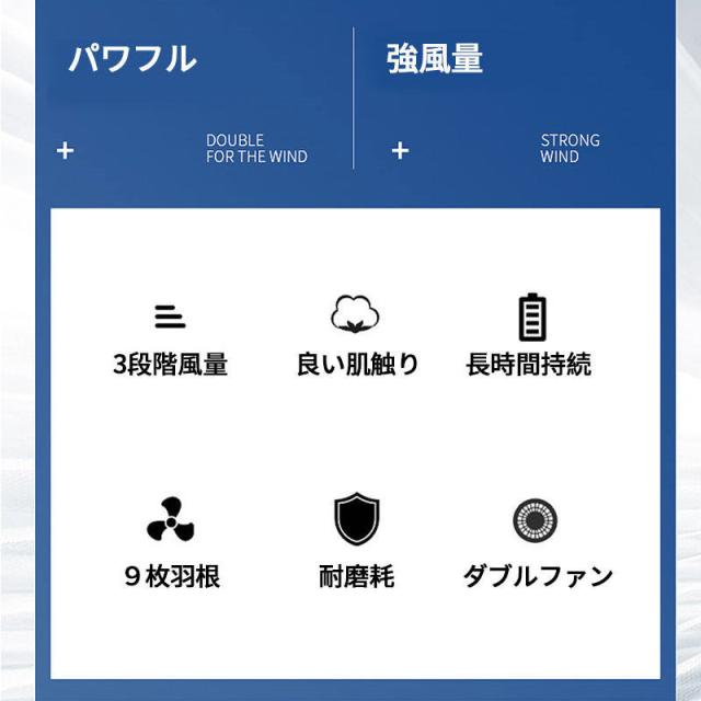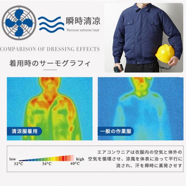 服の中に外気を取り入れ、体の表面に大量の風を流すことにより、汗を気化させて、涼しく快適にすごしていただくための製品です。 使用するエネルギーもエアコンなどに比べて格段に少なく、環境にも配慮した製品です。 工場や屋外作業などエアコンの使用できないような環境でも、快適にすごしていただけるようになります。真夏に裾のスピンドルをギュッと閉め、ファンを回せば服の中はまさに極寒クーラー状態!そんな体感したいと思いませんか!
