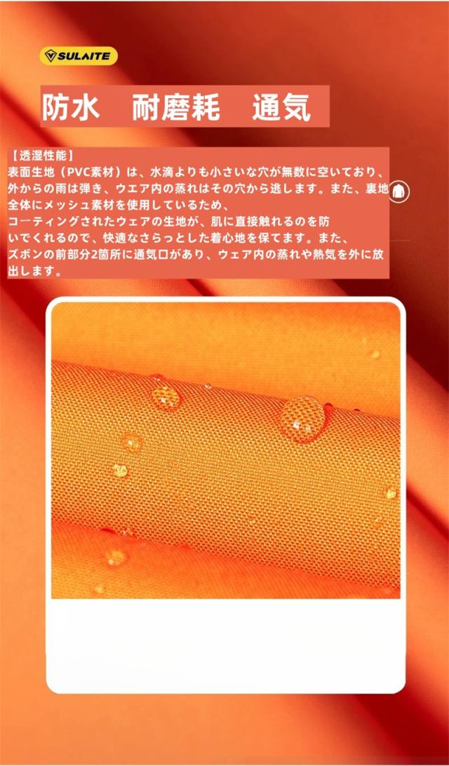 【透湿性能】表面生地(PVC素材)は、水滴よりも小さいな穴が無数に空いており、外からの雨は弾き、ウエア内の蒸れはその穴から逃します。また、裏地全体にメッシュ素材を使用しているため、コーティングされたウェアの生地が、肌に直接触れるのを防いでくれるので、快適なさらっとした着心地を保てます。また、ズボンの前部分2箇所に通気口があり、ウェア内の蒸れや熱気を外に放出します。