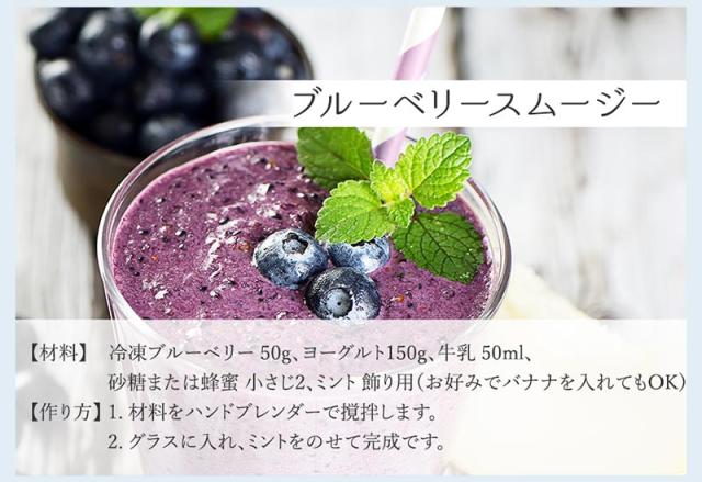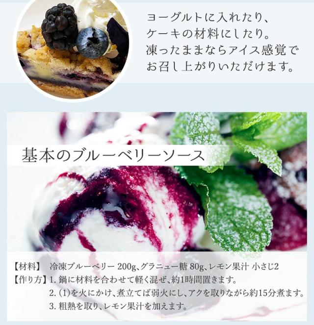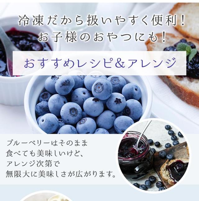 ヨーグルトやパンケーキにトッピング、ジャムやスムージーに。小粒だからお菓子作りの材料にもお勧め。栄養豊富なブルーベリーは、お子様のおやつにも最適。