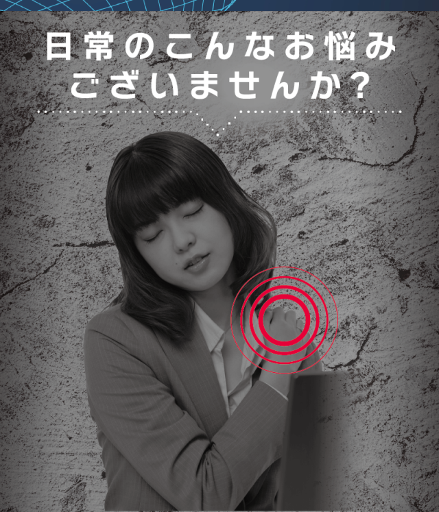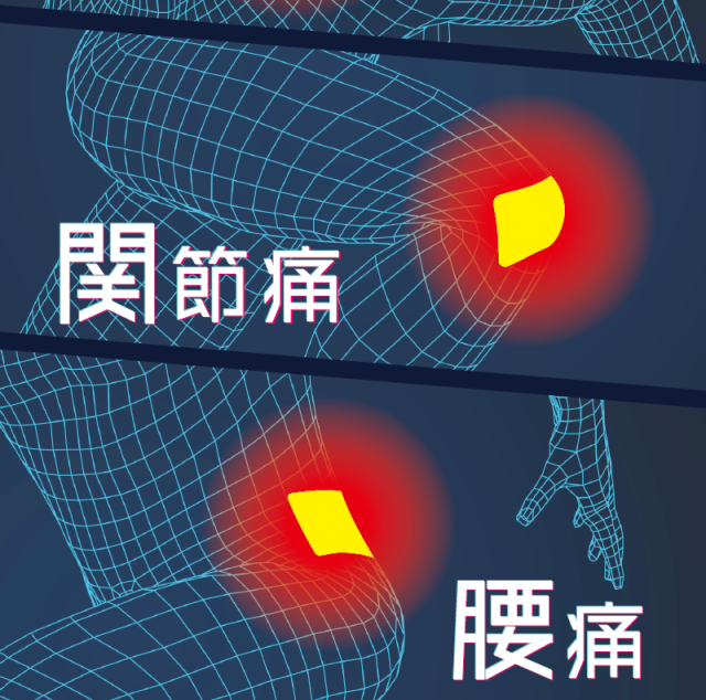 腰痛、肩こりに伴う肩の痛み、関節痛、筋肉痛、腱鞘炎(手・手首の痛み)、肘の痛み(テニス肘など)、打撲、捻挫