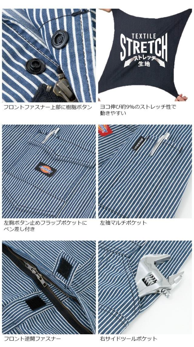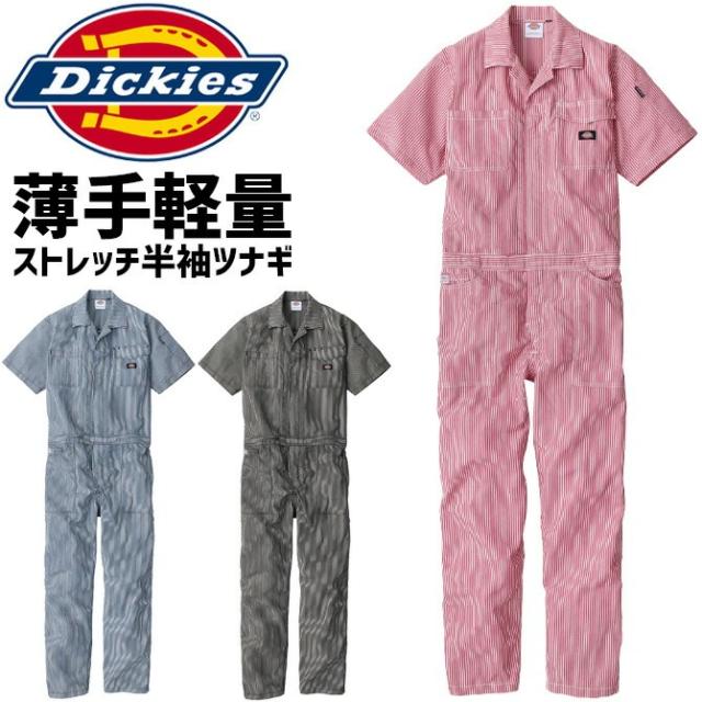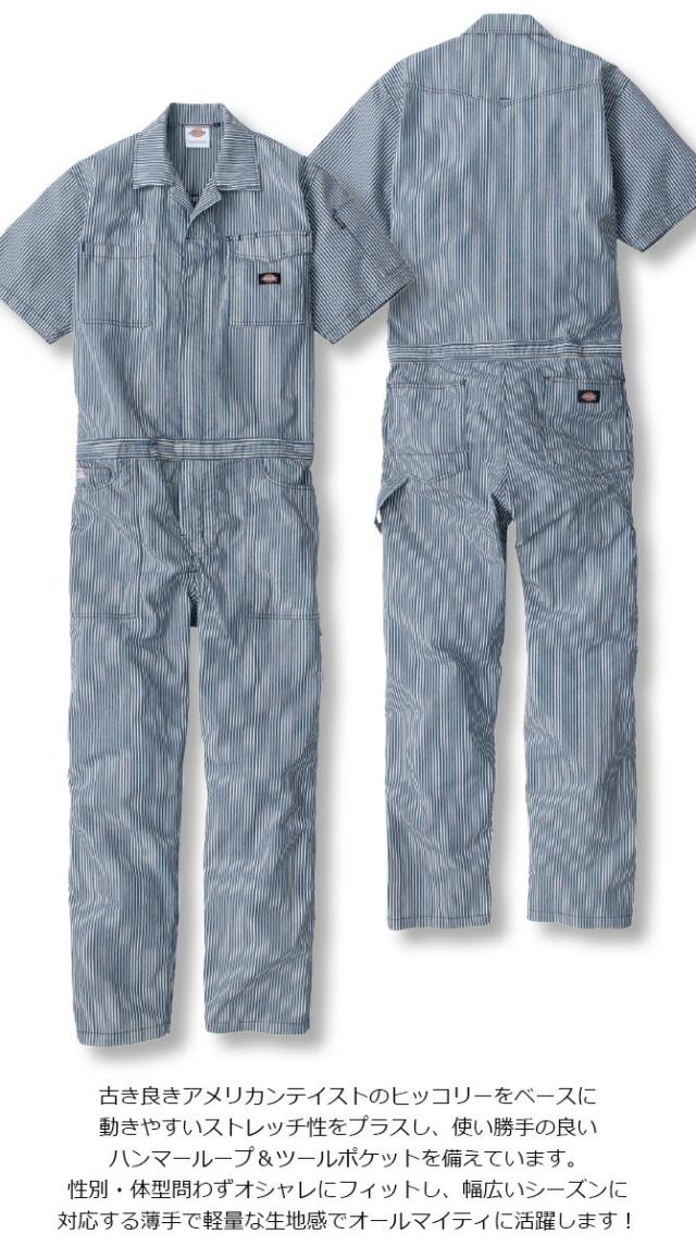 ディッキーズ ライトストレッチ ヒッコリー 半袖ツナギ D-7102 メンズ レディース 春夏 接触冷感 UVカット Dickies オールインワン カバーオール ワークウェア アウトドア 作業服 作業着