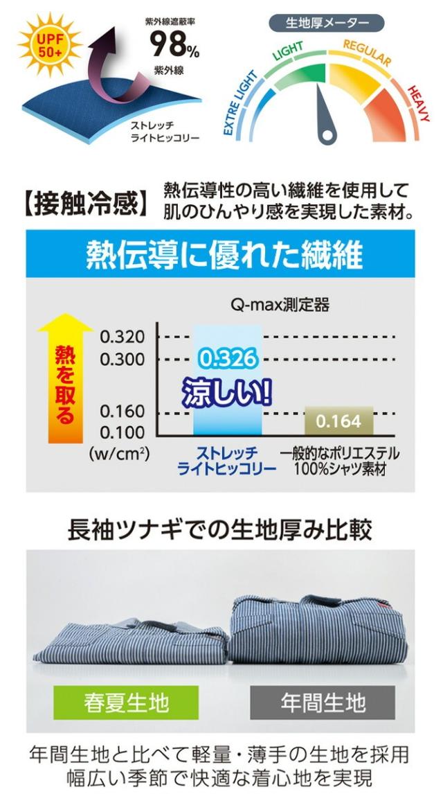 薄手で軽量な生地は接触冷感性と、紫外線による日焼けから肌をガードするUVカット(紫外線遮蔽率98%UPF50+)機能を備えており、春夏を中心に幅広いシーズンに対応します。