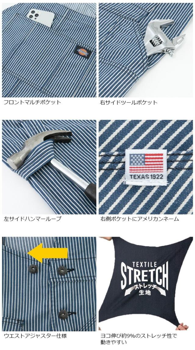 ディッキーズ ライトストレッチ ヒッコリー オーバーオール D-7109 メンズ レディース 春夏 接触冷感 UVカット Dickies サロペット カバーオール ワークウェア アウトドア 作業服 作業着