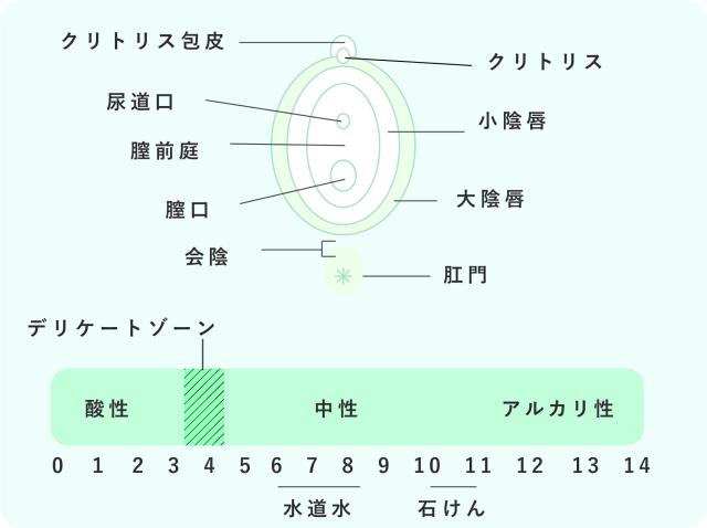 Qデリケートゾーンのケアは必要? A年齢を重ねたり、日々忙しく過ごしたりして、デリケートゾーンのうるおいは失われがち。デリケートゾーンを清潔に保湿し、健やかに整えることは、肌にうるおいを与えてくれます。 Qどこをどのようにケアしたらいい? Aデリケートゾーンのケアは、小陰唇より外側(下図参照)を丁寧に洗い、保湿します。必ず粘膜部分を避けて行います。 デリケートゾーンはPH値が3.8〜4.5とされていますので、ソープやミルクなどはデリケートゾーン用のものを使いましょう。 | |