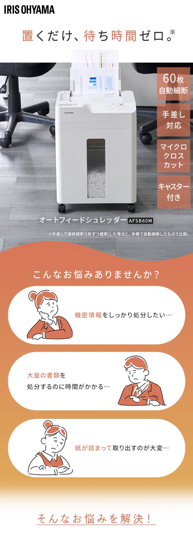 シュレッダー 電動 家庭用 業務用 マイクロクロスカット キャスター付き コンパクト 18.5L リバース機能 手差し対応 最大60分連続使用 A4 8枚 オートフィードシュレッダー ホワイト アイリスオーヤマ AFSB60M 送料無料