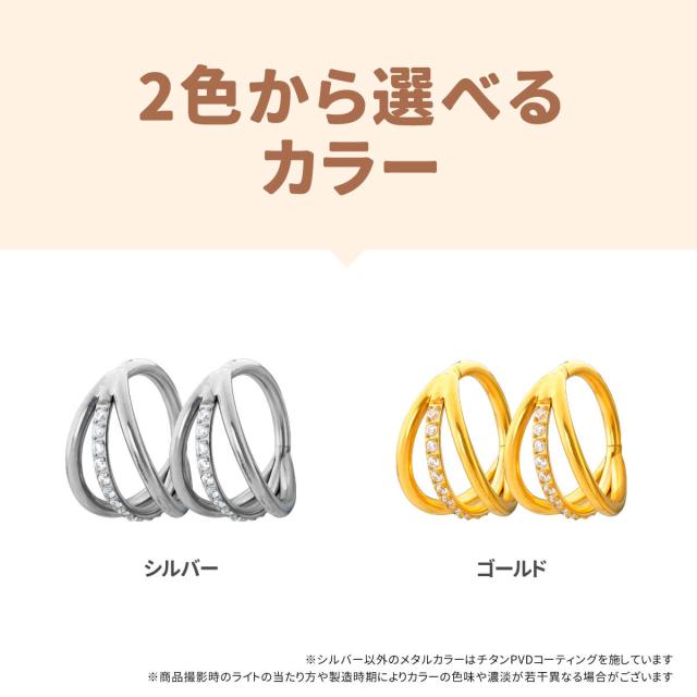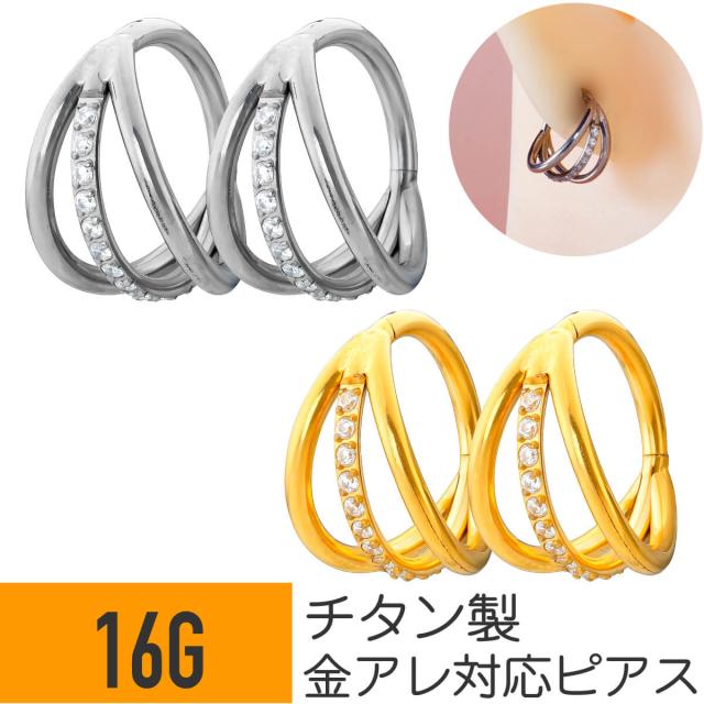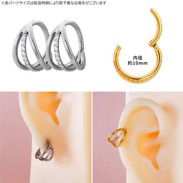 2個セット チタン 3連 ライン ジュエル ワンタッチ リング フープ ピアス 16G セグメント ヘリックス コンク 軟骨ピアス ボディピアス
