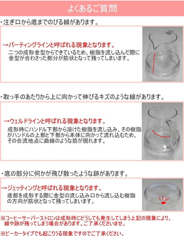 ガラスのように透明なのに割れない! 丈夫なコーヒーサーバー「ストロン」のビーカータイプです。 本体には哺乳瓶や医療部品にも使用される「トライタン」樹脂を使用しており、安全性が高く、落としても割れにくいのが特徴です。 注ぎやすく、液だれしにくい理想的な注ぎ口。 実用容量600mlタイプは約4杯分です。 口が広いのでお手入れ楽々、食器洗い乾燥機もご使用いただけます。 便利な目盛付き。 |
