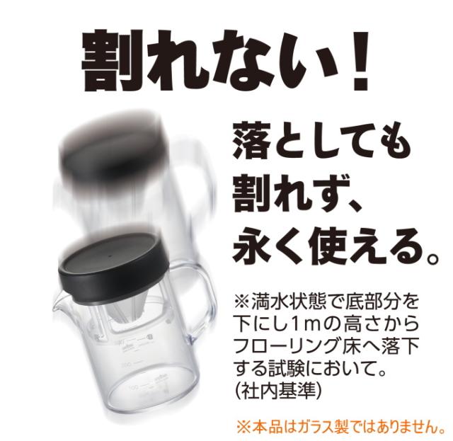 割れないプラスチック製コーヒーサーバーにコンパクトな専用ドリッパーがプラス。 コーヒーサーバー本体内にドリッパーが収納できるので、かさばらず持ち運びにも便利! アウトドアにもおすすめです。 サーバーはスマートなビーカータイプ。 食器洗い乾燥機対応。 ペーパーフィルタは「円すい形」1〜2人用をご使用ください。 |