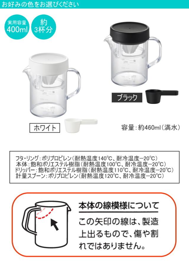 フタ・リング:ポリプロピレン(耐熱温度140℃/耐冷温度−20℃) 本体:飽和ポリエステル樹脂(耐熱温度100℃/耐冷温度−20℃) ドリッパー:飽和ポリエステル樹脂(耐熱温度110℃/耐冷温度−20℃) 計量スプーン:ポリプロピレン(耐熱温度120℃/耐冷温度−20℃) |