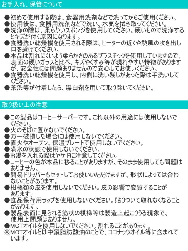 本品はガラス製ではありません。 製品表面に見られる筋状の模様などは製造上起こりうる現象で、使用上問題はありません。 電子レンジはコーヒー等の温めのみ可能です。(ふたをしたまま使用できます) 直火やオーブン、保温プレートで使用しないでください。 |