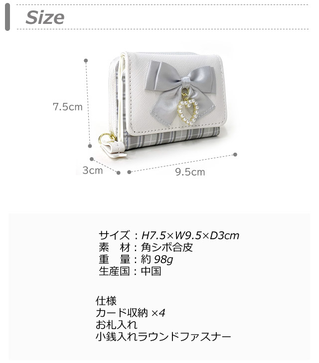 ![]() ![]() ![]() ![]() ![]() ![]() ・Merry Crown メリークラウン リボンチェック 揺れるハートチャーム付きリボンがかわいいキッズ・ジュニア向けのミニ財布。 カード収納も豊富で小銭入れは使いやすい三つ折りタイプ。 小学生・中学生・高校生の女の子に人気で、お誕生日やクリスマス等のプレゼントにもおすすめです。
