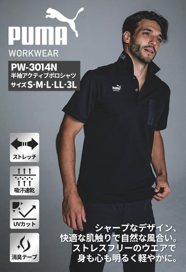 作業ウェア PUMA プーマ 半袖アクティブポロシャツ メンズ 吸汗 速乾 ストレッチ 作業着 作業服 消臭テープ UVカット クールビズ 涼しい 制服 ポロシャツ ユニフォーム ポケット スポーツ ゴルフ カーキ 黒 白 春夏 ワーク PW-3014N