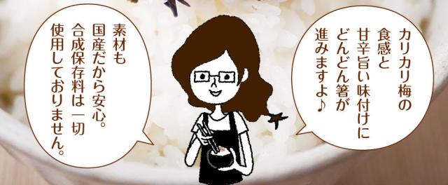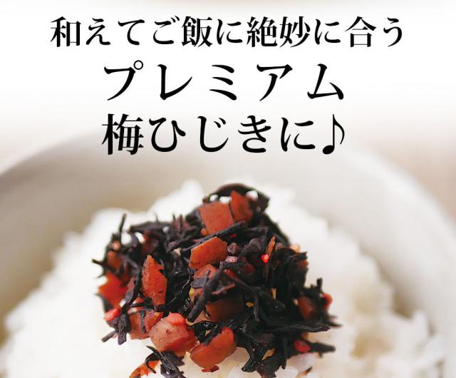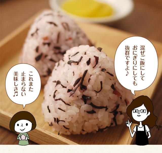 調味梅漬(梅(国産)、漬け原材料(食塩、果糖ぶどう糖液糖、醸造酢、しそ梅酢、酵母エキス))(国内製造)、ひじき、砂糖、食塩、ごま、発酵調味料、たん白加水分解物、ホタテエキス、昆布粉末、香辛料/酒精、酸味料、調味料(アミノ酸等)、香料、ビタミンB1、着色料(赤102)、(一部にごまを含む)