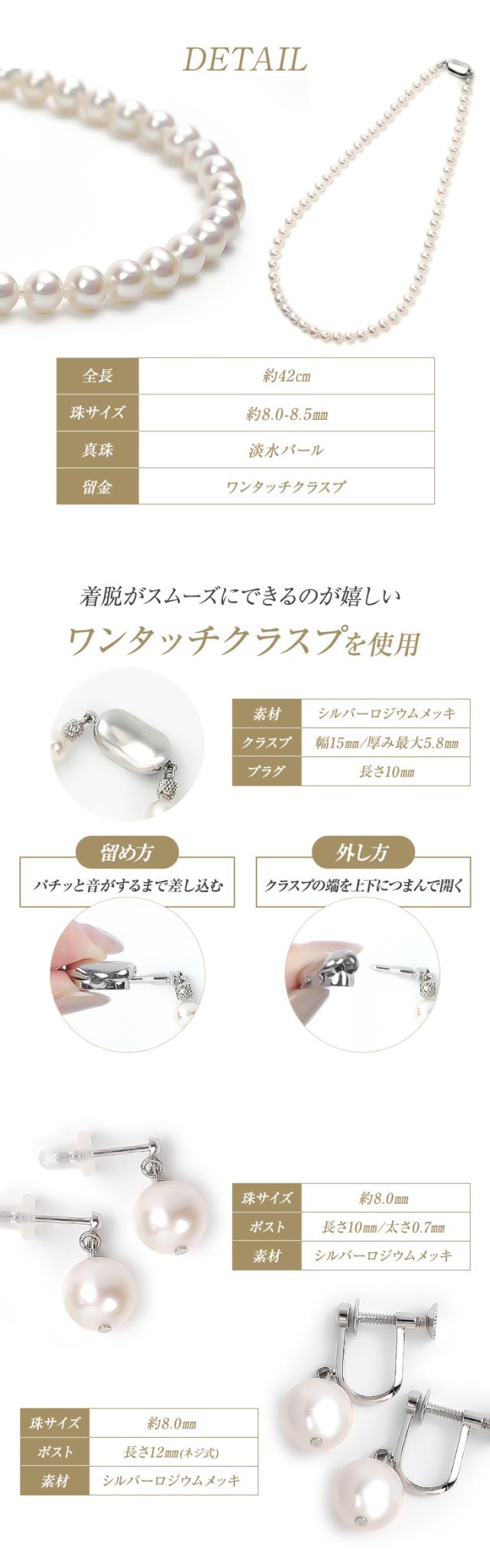 | ネックレス スペック | 全長 約42cm 珠の大きさ 約8.0-8.5mm 素材 淡水パール 留め具:シルバーロジウムメッキ(ワンタッチクラスプ) |