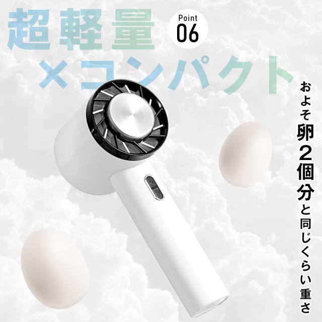 小さなバッグにもすっぽり入る超コンパクトサイズに、重さわずか2個卵の重さで、手持ちで使っても、バッグや通勤カバンに入れても負担にならない携帯扇風機です。自宅、会社、車内、通勤、通学、お買い物、散歩、花火大会、お祭り、野外フェス、イベント、スポーツ観戦、キャンプ、旅行、アウトドアなどなど、様々なシーンに大活躍し、暑さを気にせずに夏らしいあそびをいっぱい楽しむことができる 携帯扇風機 です。