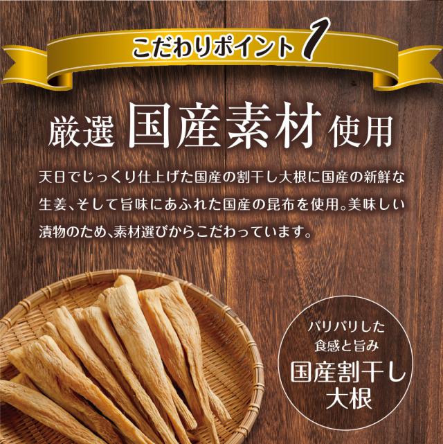 だいこん(国産)、しょうが(国産)、こんぶ(国産)、漬け原材料[砂糖、ぶどう糖果糖液糖、しょうゆ、発酵調味液、醸造酢]/調味料(アミノ酸)、カラメル色素、増粘剤(キサンタンガム)、酸化防止剤(ビタミンC)、(一部に小麦・大豆を含む)