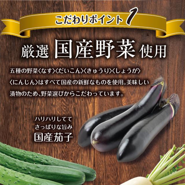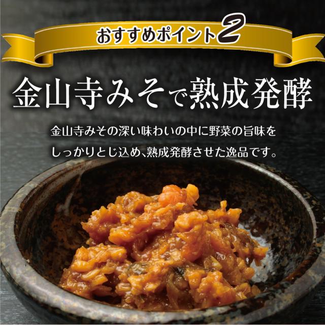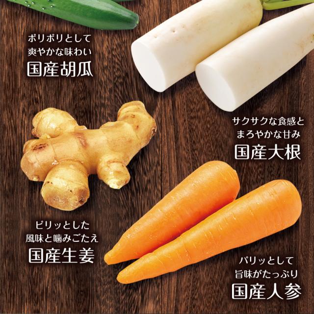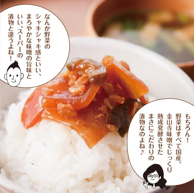 大根(国産)、金山寺味噌、茄子(国産)、砂糖、ぶどう糖果糖液糖、胡瓜(国産)、醤油、生姜(国産)、人参(国産)、発酵調味液、醸造酢、唐辛子/調味料(アミノ酸)、カラメル色素、酸化防止剤(ビタミンC)、香料、(一部に小麦・大豆を含む)