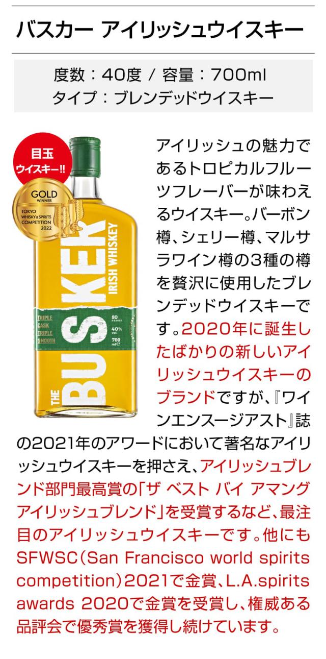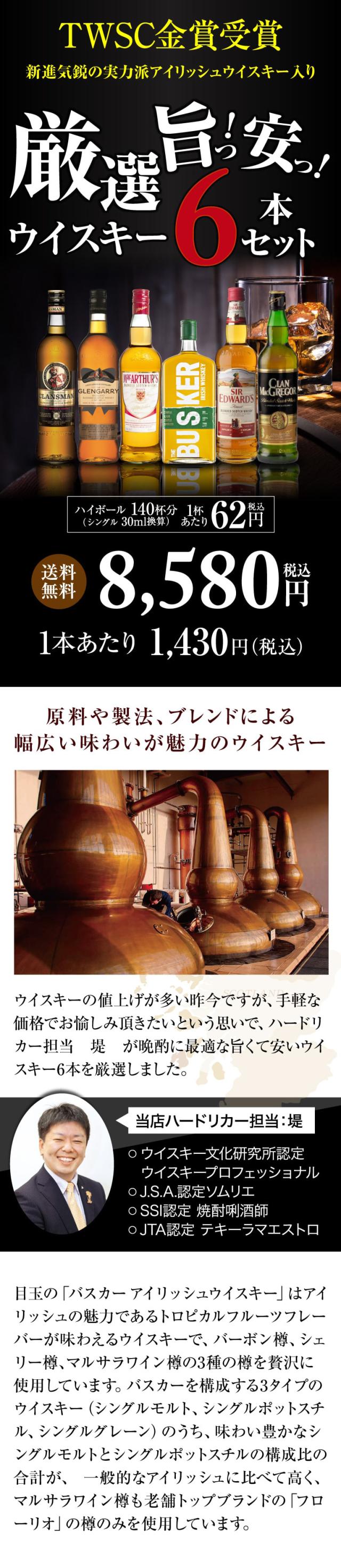 新進気鋭のアイリッシュウイスキー「バスカー」をはじめ、厳選旨安ウイスキーを6本セットにしました。